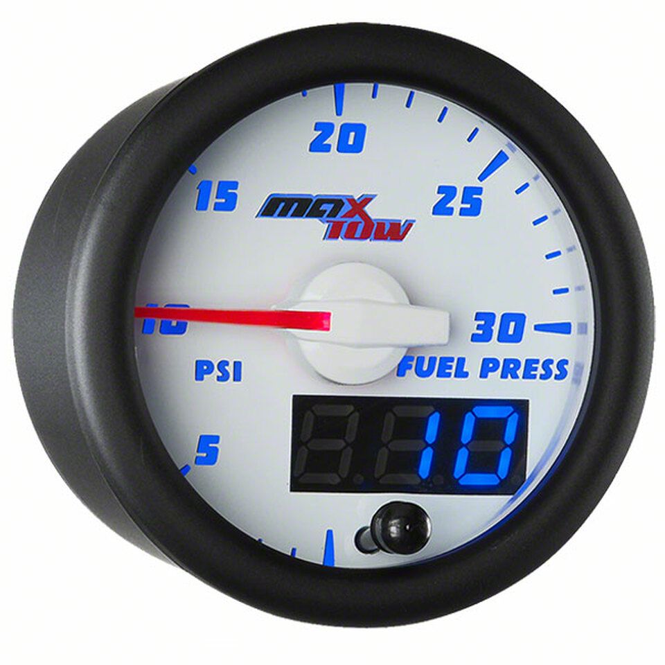 Description. MaxTow’s White Double Vision™ Series 30 PSI Fuel Pressure Gauge is an electronically driven truck gauge that includes an electronic fuel pressure sensor which reads and displays your diesel truck’s lower fuel pressure levels from 0 to 30 PSI with incredible accuracy, helping guard against damage to your fuel pump, injectors, and a loss of overall horsepower.