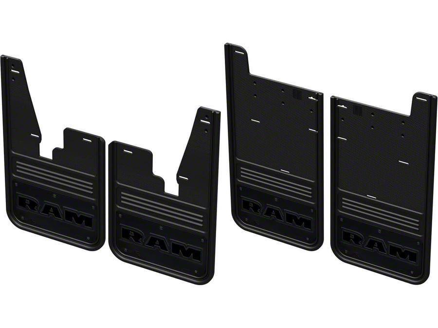 No-Drill Mud Flaps with Black Anodized RAM Text; Front and Rear (19-26 RAM 3500 SRW w/o Factory Fender Flares)Find parts that fit my vehicle