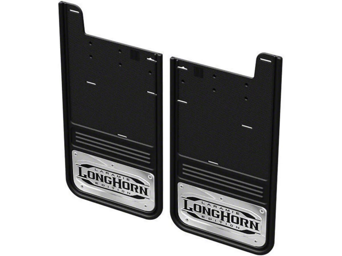 Construction and Features. Crafted from 1/2-inch-thick rubber, these mud flaps are built to withstand harsh conditions, providing long-lasting protection. The Laramie Longhorn logo insert adds a stylish touch, while the no-drill installation ensures a hassle-free setup. These flaps offer both functionality and aesthetics, keeping your truck safe from debris.