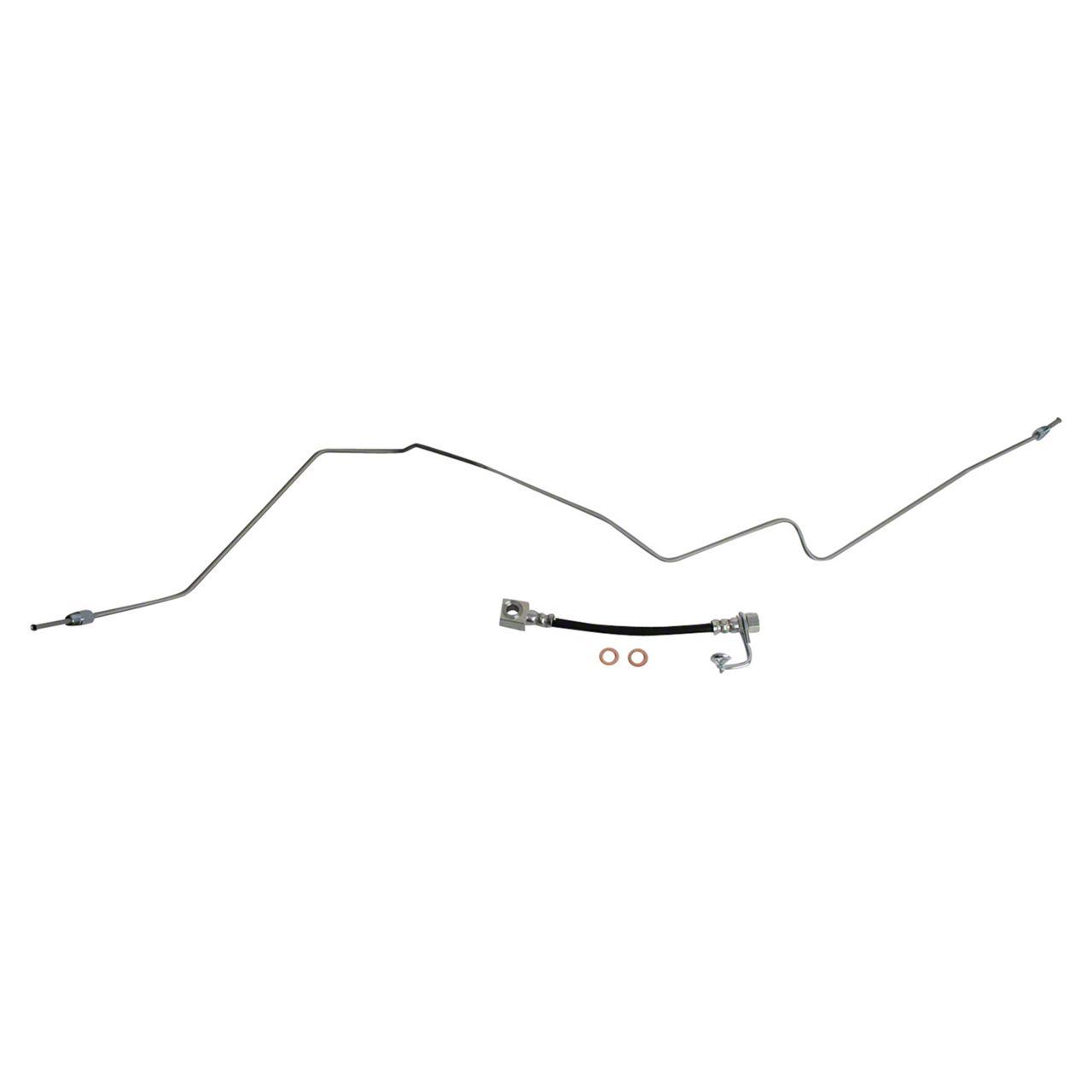 Construction and Features. Featuring steel lines with a matte black and raw metal finish, this brake hose is built for durability and long-lasting performance. Its sturdy construction ensures resistance to wear and tear, making it a dependable choice for your truck’s braking system.