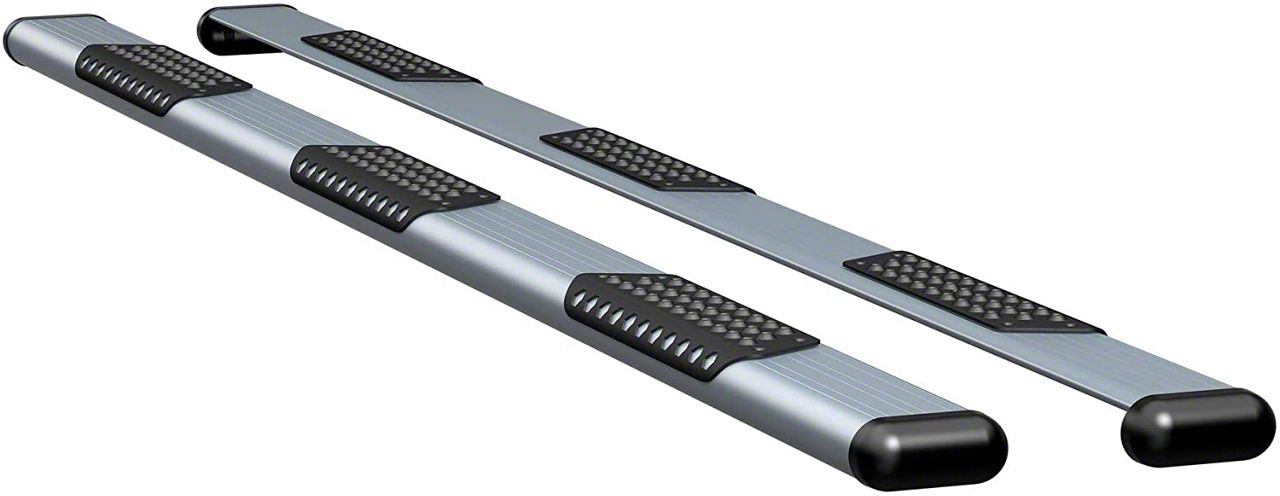 Construction and Appearance. Made from durable aluminum, these side step bars feature a corrosion-resistant silver finish for long-lasting performance. The sleek, low-profile design enhances the vehicle's appearance, while non-slip step pads at each door and bed access point ensure safe footing in any condition.