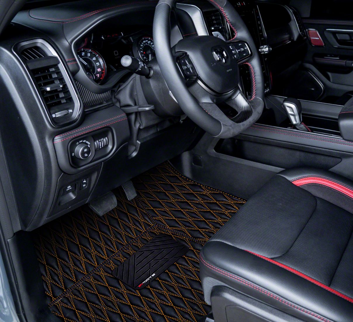 Single Layer Diamond Front Floor Mats; Black and Orange Stitching (10-18 RAM 3500 Regular Cab w/ Bucket Seats)Find parts that fit my vehicle