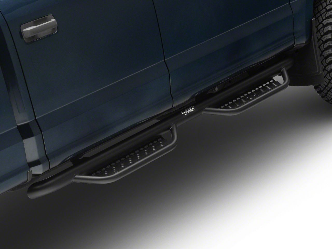 Ranch Hand Midnight Series Cab Length Side Step Bars (Matte Black). These Ranch Hand Midnight Series Cab Length Side Step Bars are the perfect addition to your Ford F-150 SuperCrew. Designed to provide both style and function, these step bars not only enhance the vehicle's appearance but also provide safe and easy access to the cab. They are crafted with heavy-duty steel and coated with a corrosion-resistant matte black finish to ensure lasting durability and protection from road debris.
