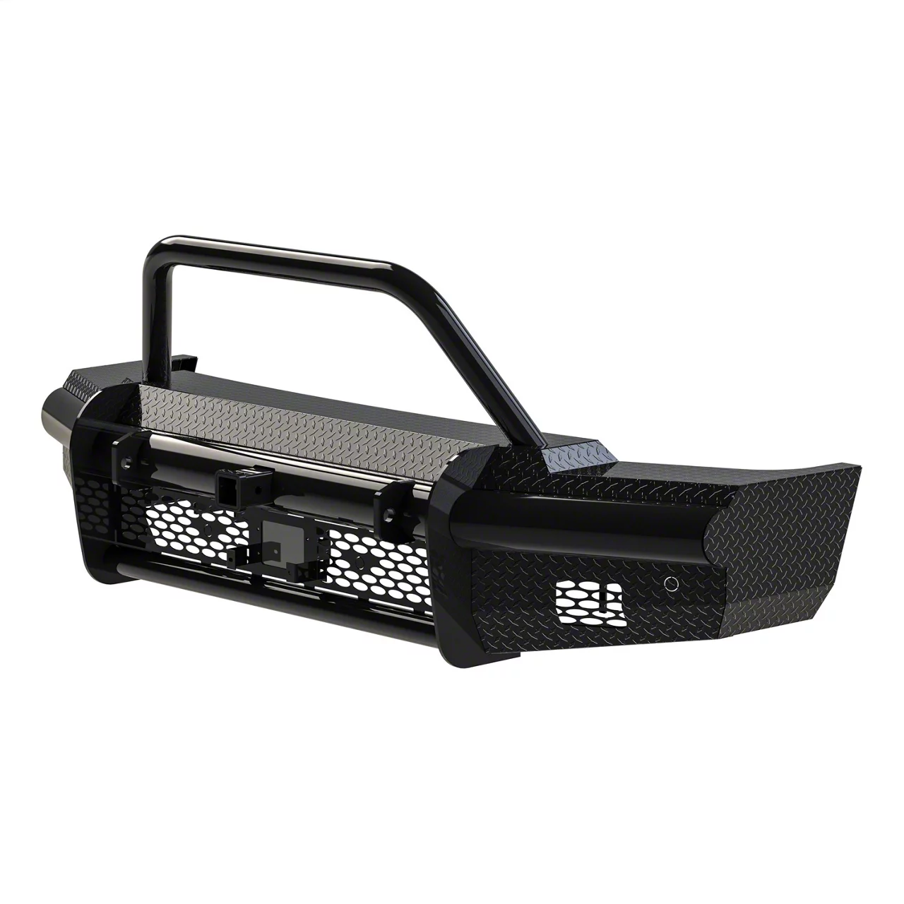 Construction and Appearance. The bumper is built using 4-inch schedule-40 pipe combined with diamond-plate steel, offering extreme durability and resistance to impacts. It is finished in a black powder-coat that resists corrosion and adds a sleek, aggressive look to your truck's front end.
