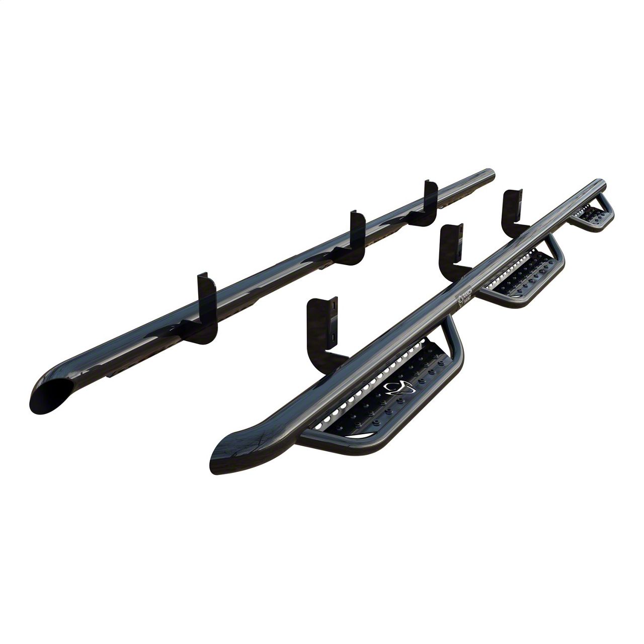 Construction and Appearance. Crafted in the USA, these step bars are made from robust 14-gauge 3-inch top piping and reinforced with 12-gauge 1-1/2-inch loop piping. The 3/16-inch-thick mounting brackets ensure solid support and structural integrity. Each side features three wide 4-inch punched steel foot steps for dependable traction, while the glossy black powder-coat finish adds corrosion resistance and aggressive curb appeal.