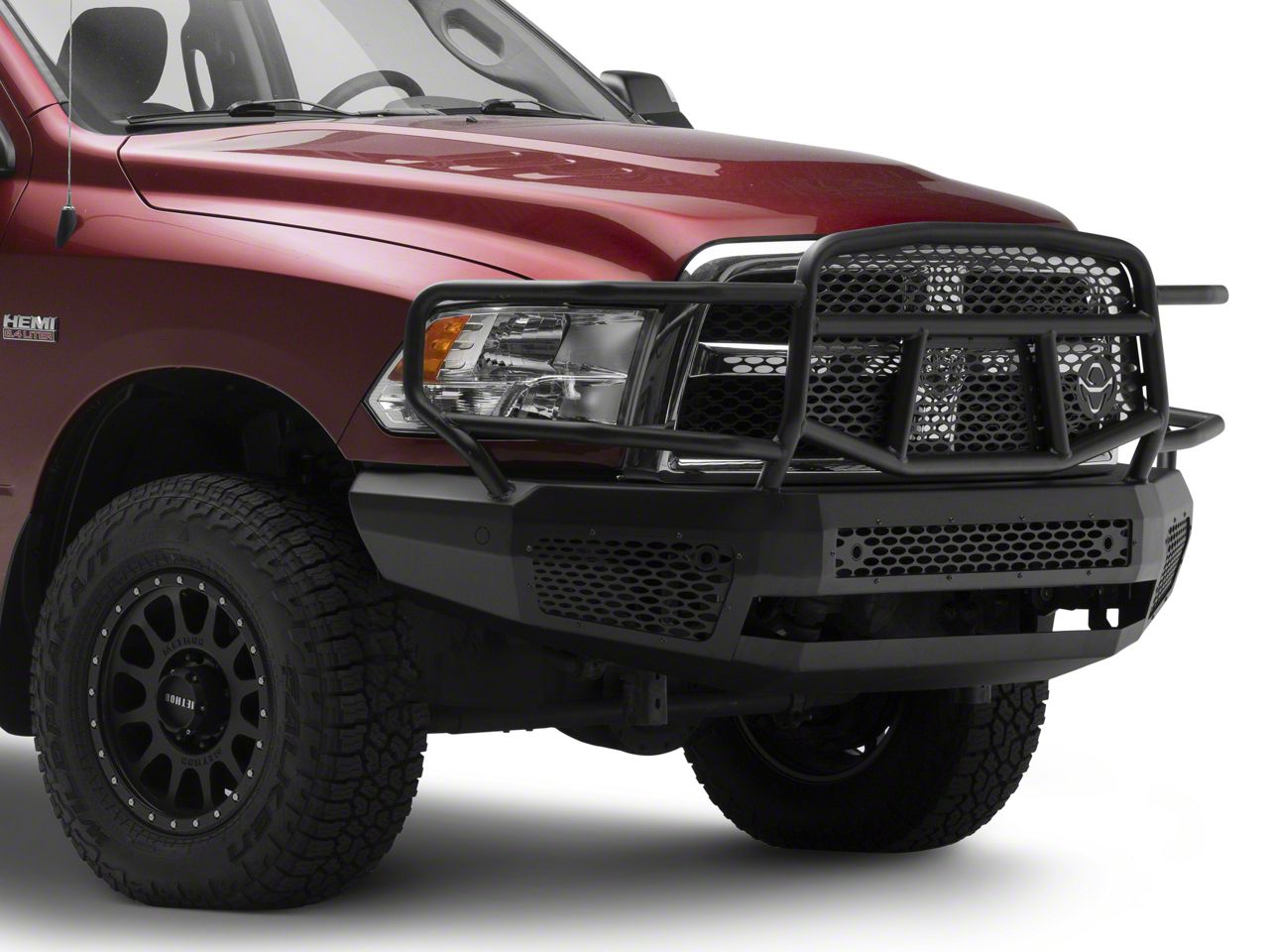 Boosts Off-Road Protection. This Ranch Hand Midnight Front Bumper with Grille Guard makes your off-road drives a lot safer. This front bumper is equipped with an extremely durable grille guard, allowing it to provide reliable front end protection. It helps safeguard your grill, headlights, and other front end components from kicked-up debris or from the impacts of crashes and collisions.
