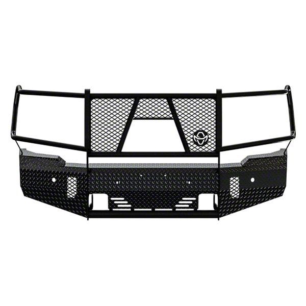 Heavy-Duty Upgrade. Ranch Hand constructed this front bumper, and its grille guard, from diamond-plate steel. They also covered it with a black powder-coated finish, so it won’t be easily damaged by rust and corrosion.