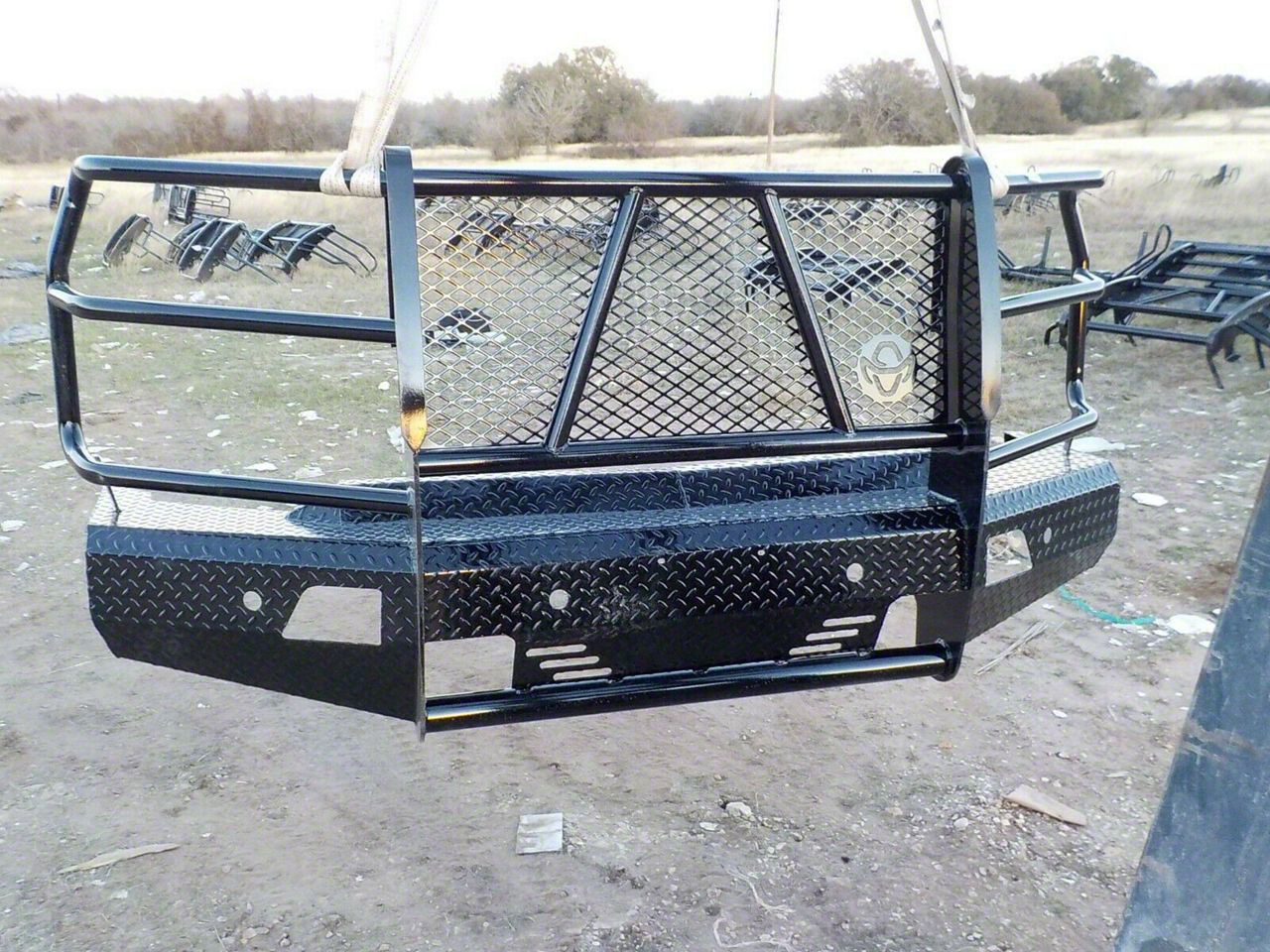 Heavy-Duty Construction. This Front Bumper features heavy-duty, diamond-plate steel construction for remarkable durability that lasts for years. Its full grille guard, on the other hand, is made of 12-gauge steel tubing for added front-end strength. Finally, a durable black powder-coated finish completes this bumper for maximum corrosion protection, and to give your vehicle an even more impressive look than before.