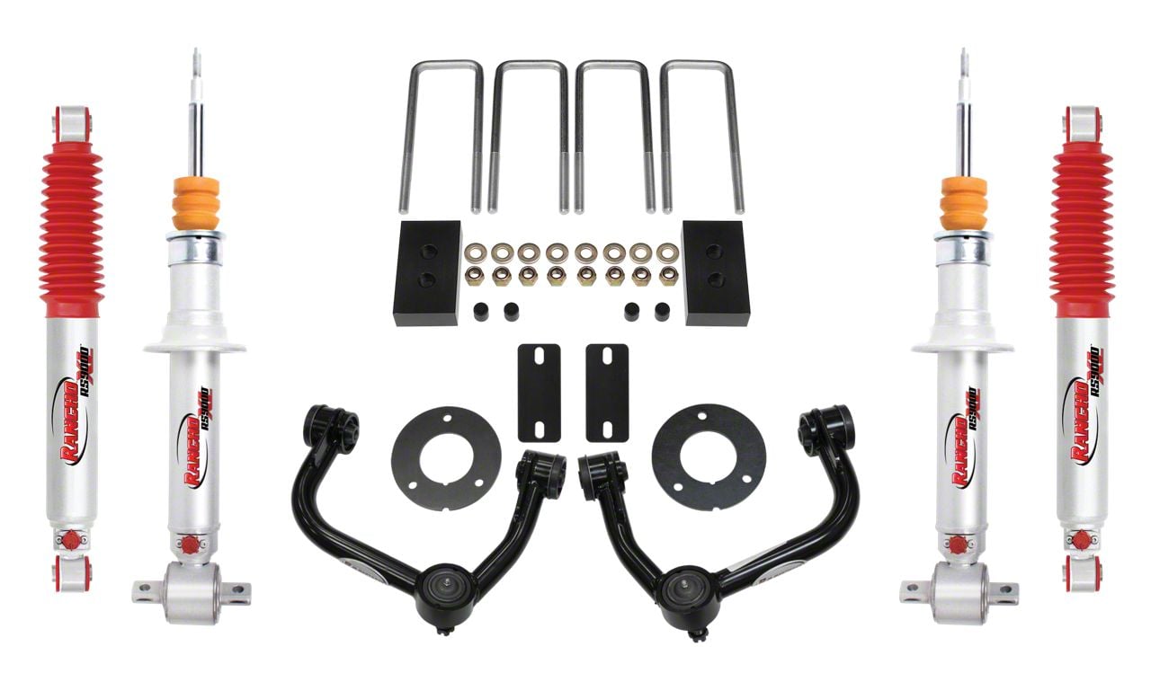 Lifted Stance. Lift and level out the stance of your 4WD F150 with a Rancho Suspension Lift Kit. This kit provides a fast and easy kit to raise your F-150's ride height by 3-inches. This kit features RS9000XL 9-position adjustable series shocks and struts, tubular control arms, sway bar spacers and rear lift blocks to provide superior on road comfort and off-road performance. The sway bar spacers correct end link angles for roll and sway control of your F-150. The kit was designed with 35-inch tires in mind, and lifts the front by 3-inches. This kit will allow the reuse of OE Wheels and Tires.