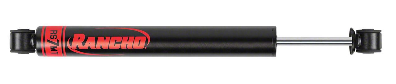 Construction and Appearance. Constructed with a 14mm hardened chrome piston rod, the Rancho RS7MT ensures durability and strength. The shock features a sleek black satin finish, highlighted with a distinctive red Rancho logo, adding a stylish touch to your vehicle. The Rancho RS7MT Rear Shock includes an integrated dirt wiper that effectively keeps moisture, dirt, and debris from contaminating the oil, ensuring long-lasting performance.