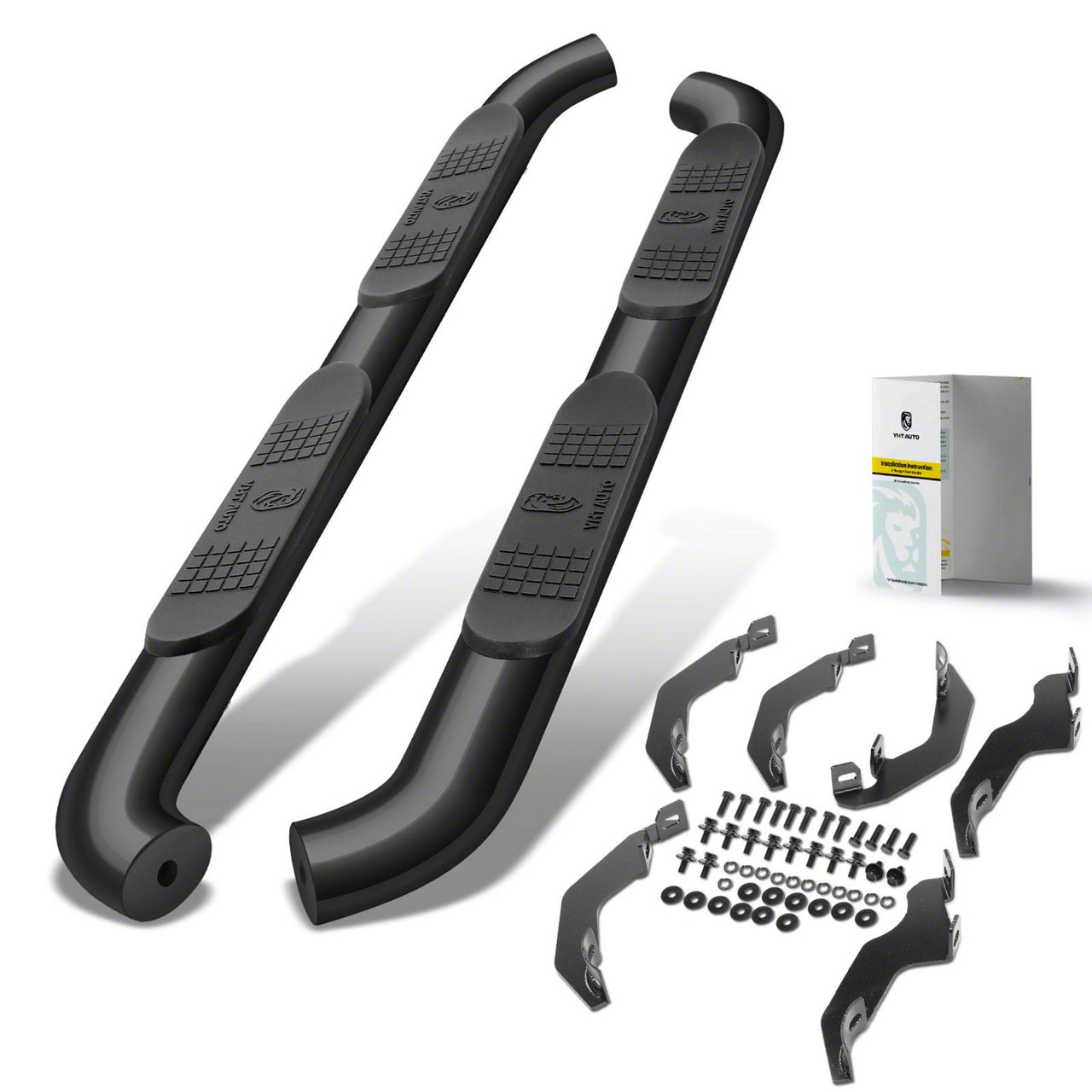 Construction and Appearance. Made from sturdy steel, these side steps feature a reinforced framework that resists bending and promotes durability. The semi-gloss black powder finish offers a sleek appearance while ensuring long-lasting color retention even under prolonged sun exposure.