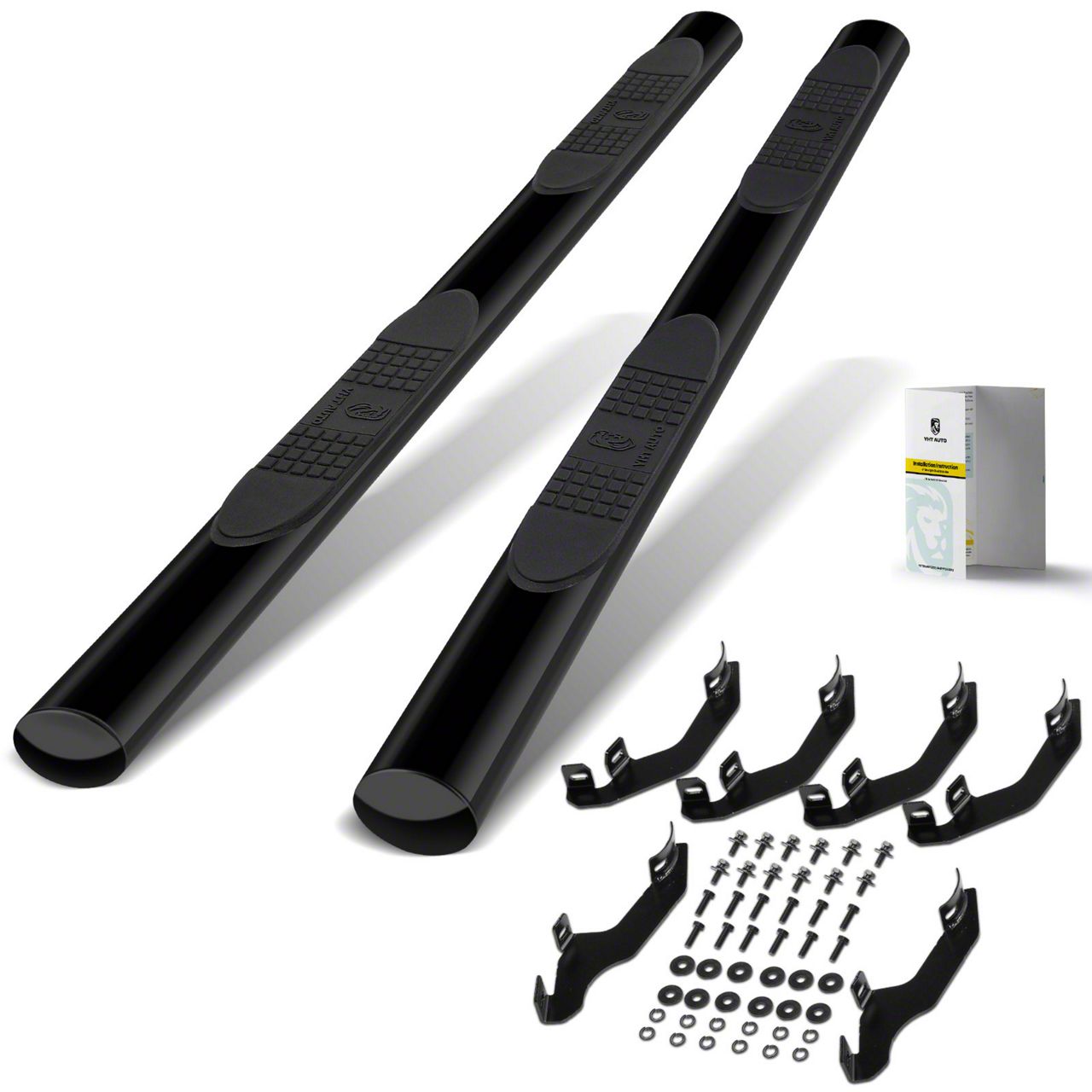 Construction and Appearance. Crafted from solid steel, the step bars feature a semi-gloss black powder-coated finish that resists corrosion and complements the vehicle’s exterior with a sleek, durable look.