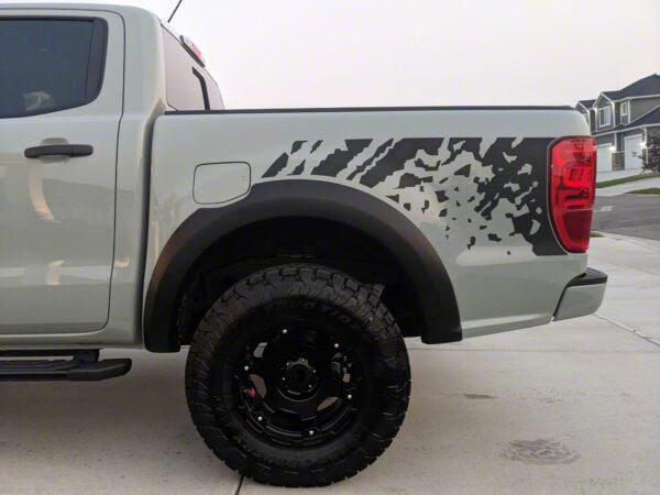 Rugged Styling. The Bed Side Digital Mud Splash Graphics in Matte Black is a premium accessory designed specifically for your Ford Ranger. These graphics feature a striking mud splash design that adds a touch of ruggedness to your truck’s exterior. With precision-cutting technology, these graphics ensure a seamless fit on your ride’s bed sides. They are also weather-resistant, capable of withstanding various environmental conditions without fading or peeling.