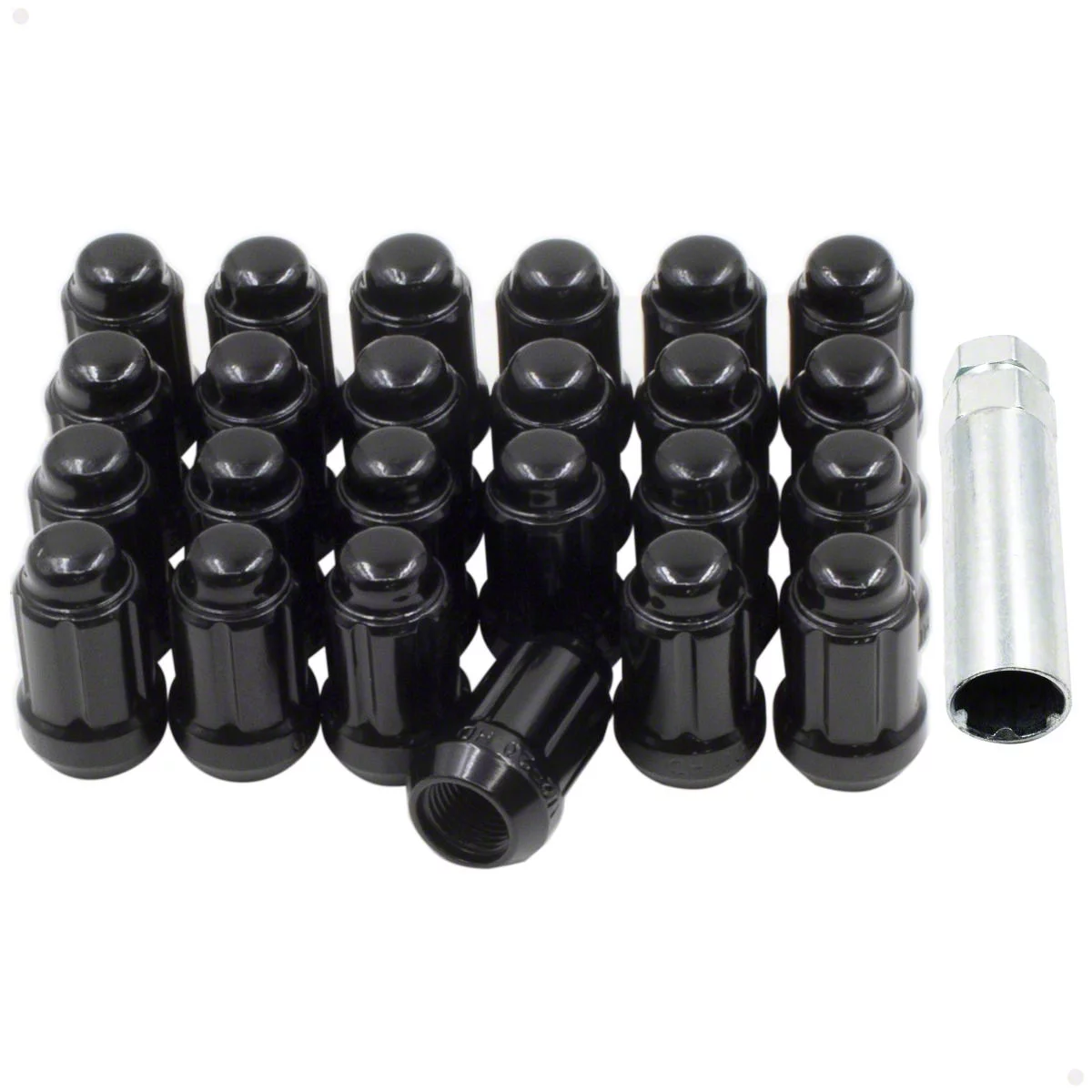 Construction and Appearance. Each lug nut is crafted from cold forged carbon steel and finished in a glossy black coating for a durable, corrosion-resistant surface. Designed to meet SAE standards, the extended 6-spline profile enhances grip while adding an aggressive, high-performance look. Their uniform finish provides a clean, modern upgrade that pairs well with dark or custom wheels.