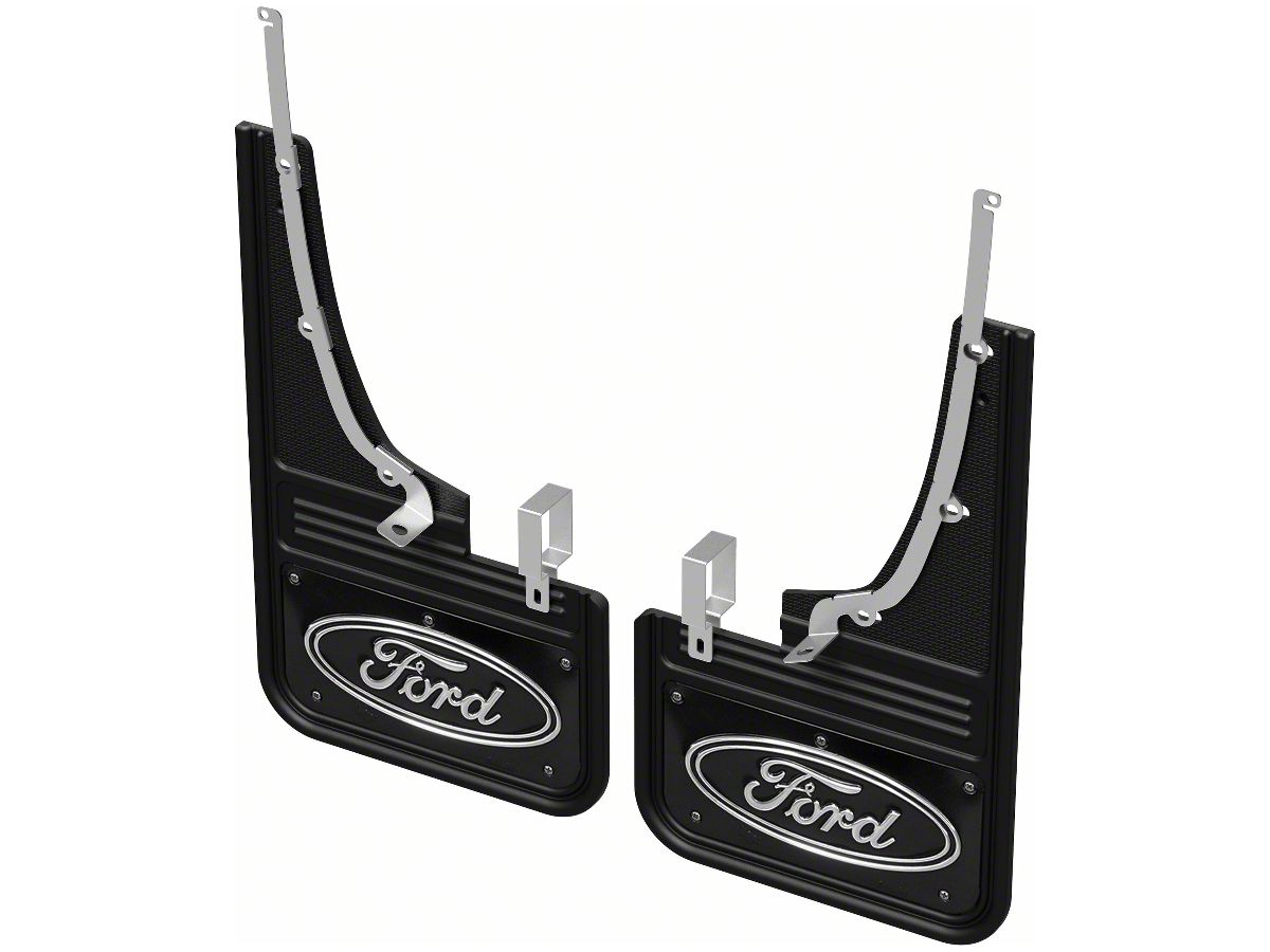 Construction and Appearance. Made from premium virgin rubber, these mud flaps provide strength and longevity under varying road conditions. The integrated stainless steel plate emblazoned with the Ford Oval Logo adds a bold and polished accent to the exterior. Each component is precision-formed to ensure a resilient structure with a clean, rugged aesthetic.