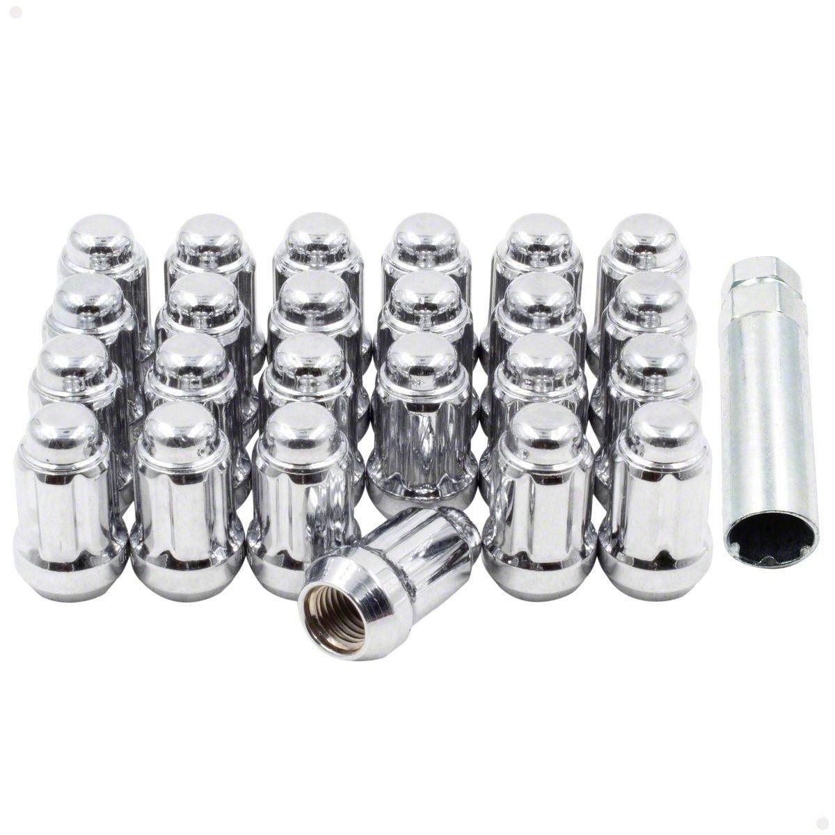 Premium Lug Nut Kit. The Chrome 6-Spline Lug Nut Kit; M12 x 1.5; Set of 24 offers a complete set of lug nuts designed to securely fit aftermarket wheels, ensuring safe and reliable mounting. These lug nuts provide a precise fit essential for maintaining proper wheel alignment and vehicle safety.