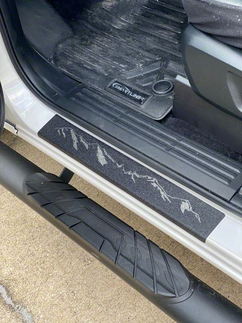 Maintain a Scratch-Free Door Sill. The Front Door Sill Protection with Mountain Logo is designed to guard your door sills against scratches and damages, while adding style to your interior. Made from high-quality materials, this protection features a textured black finish and a mountain logo design that gives a unique look to your interior. It is also manufactured in the USA so you can rely on its top-notch quality and durability. With this exact fit protection in place, you can enjoy the appearance and functionality of your vehicle without having to worry about damage on your door sills.