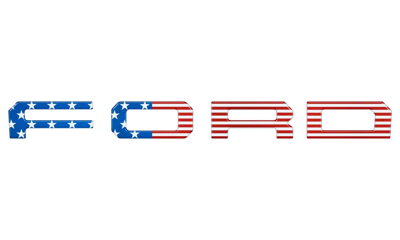 Stylish Front Enhancement. The Front Grille Letter Overlays; American Flag provide an instant visual upgrade by overlaying raised, stylish "FORD" lettering on your truck's front grille. Designed specifically to complement the OE Ford Raptor Style Grille, this kit enhances the vehicle's appearance with precise fitment and striking detail.