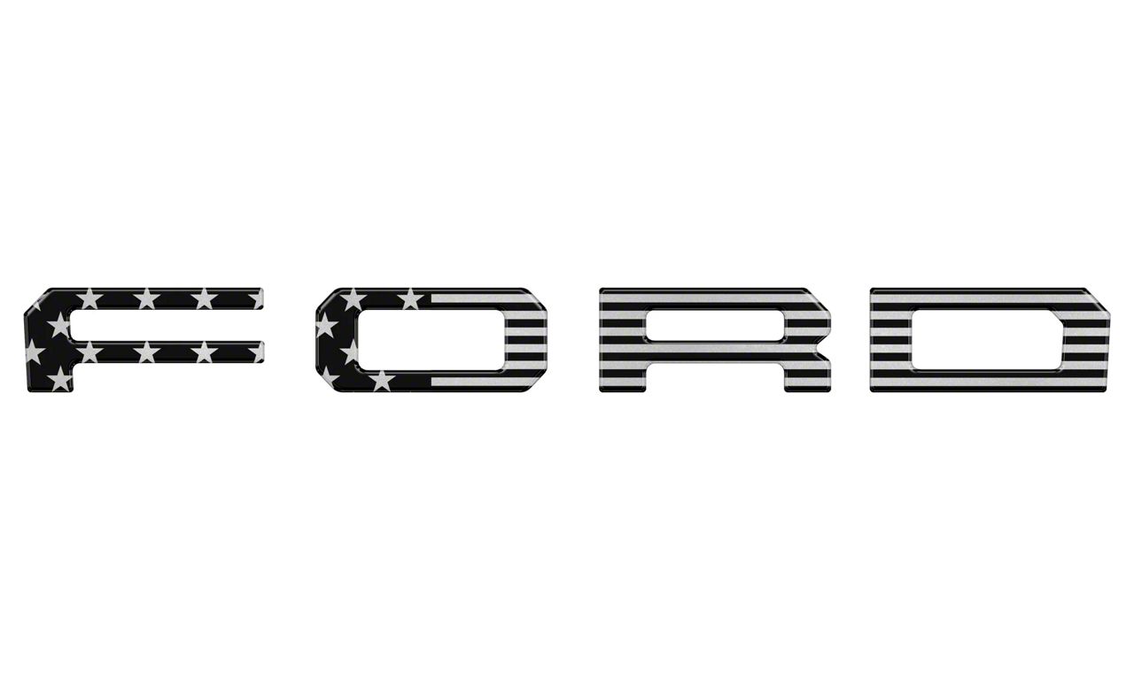 Stylish Grille Enhancement. The Front Grille Letter Overlays; Black and Metallic Silver American Flag add a distinctive and bold look to the front grille of your vehicle. These overlays enhance the appearance by featuring raised “FORD†lettering that overlays the original equipment grille, updating your truck’s front end with a fresh and aggressive style.