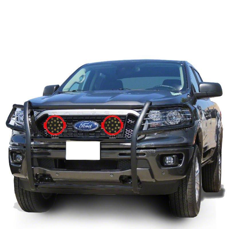 Application. This Grille Guard with 7-Inch Red Round LED Lights in Black fits all 2019-2023 Ford Ranger models.