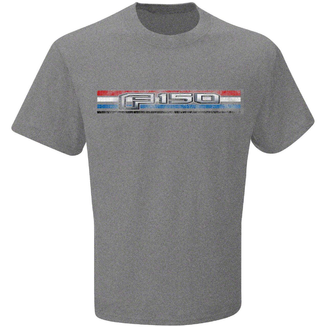 Ford Themed Graphic T-Shirt. This great looking gray short sleeve t-shirt is a must have for all Ford enthusiasts. Officially licensed, this graphic tee features the modern F-150 logo over red, white and blue stripes. This T-Shirt makes the perfect gift for yourself or the fellow Ford lover in your life.