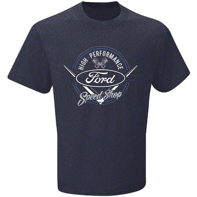 Ford Themed Graphic T-Shirt. This great looking navy blue short sleeve t-shirt is a must have for all Ford enthusiasts. Officially licensed, this graphic tee features the High Performance Ford Speed Shop logo. This T-Shirt makes the perfect gift for yourself or the fellow Ford lover in your life.