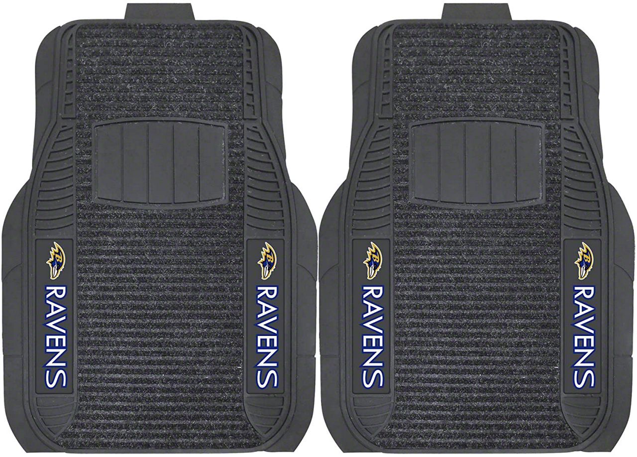 Application. These Molded Front Floor Mats with officially-licensed Baltimore Ravens logo feature a universal design so they will fit most makes and models of vehicles. These Mats can be trimmed to fit if necessary. Sold as a set of two Front Mats.