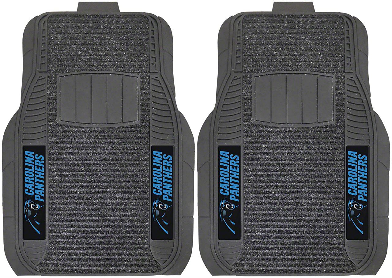 Application. These Molded Front Floor Mats with officially-licensed Carolina Panthers logo feature a universal design so they will fit most makes and models of vehicles. These Mats can be trimmed to fit if necessary. Sold as a set of two Front Mats.