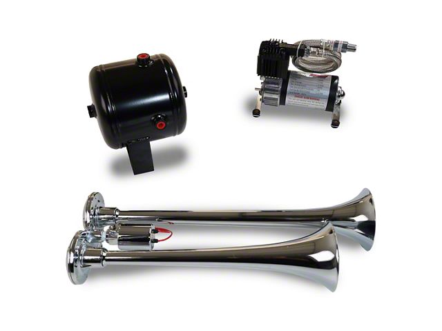 ProBlaster Dual Air Horn System. The ProBlaster Dual Air Horn System is designed to provide a powerful and attention-grabbing sound for your vehicle. Featuring a polished chrome finish and a compact design, this air horn system includes dual horns measuring 16.75 and 14.5 inches, ensuring a loud and clear signal. This universal fit system is suitable for various vehicle types, offering both style and functionality.