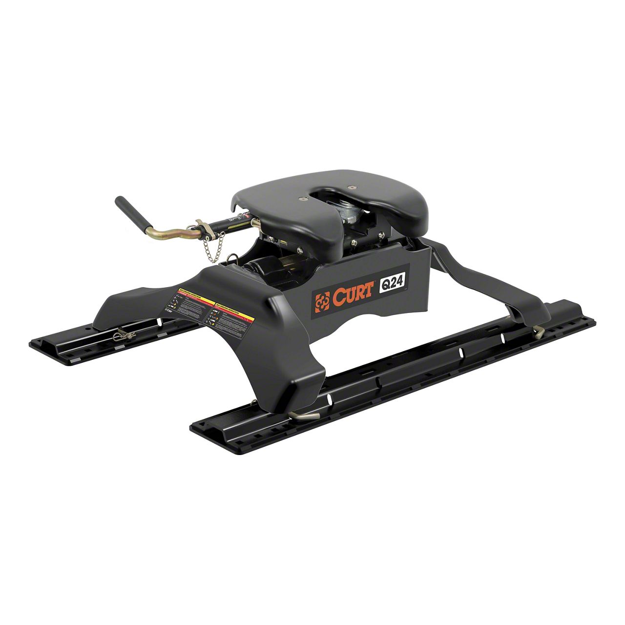 Tackle Heavy Towing with a High-Performance 5th Wheel Hitch. The Q24 5th Wheel Trailer Hitch with Rails is a powerful towing solution for drivers needing to haul heavy trailers. With a 24,000-pound capacity, it can handle even the toughest towing jobs. The pivoting head ensures a smooth ride by reducing noise and vibration, while the automatic locking jaw system provides a secure and reliable connection.