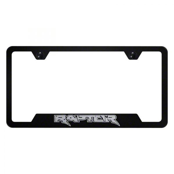 Construction and Appearance. Made in the USA, this License Plate Frame is made from stainless steel with a rugged black finish. "Raptor" is written in chrome on the bottom of the frame and it comes with vehicle-specific hardware.