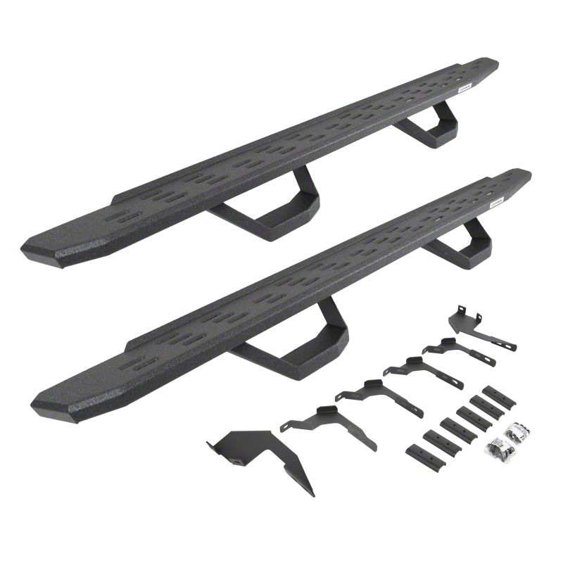 Meet the third edition of the legendary Go Rhino RB Series of running boards: the RB30. The RB30 is the next generation of Raptor-inspired design that will make your truck, Jeep, Bronco or SUV stand out from the crowd. With its aggressive, stylish appearance, this cab-length, bolt-on side step provides maximum traction and features an open flow-through design that prevents mud, ice, and snow from accumulating. The corrosion-resistant 16-gauge steel step mounts tightly to factory mounting points along the lower rocker panel, providing plenty of clearance for off-roading, and it’s strong enough to support 300 lbs. per stepping surface for 600 lbs. per board. Matching drop steps will make entering and exiting lifted vehicles even easier. The RB30 Running Board is 7” wide for most its length before it tapers (compared to 5” wide for the Slim Line version). All RB Series Running Boards are available in Textured Black Powder Coat or Protective Bedliner finish, made in North America and offer a limited lifetime warranty against manufacturer and material defects, with a 5-year warranty on the finish.