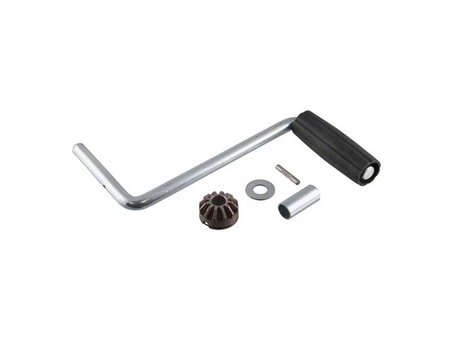 Durable Construction. The jack handle is made of firm and comfortable black plastic for better grip while the metal part is a clear zinc finish for corrosion protection. This jack handle kit comes complete with a mounting pin, gear, and bushing.