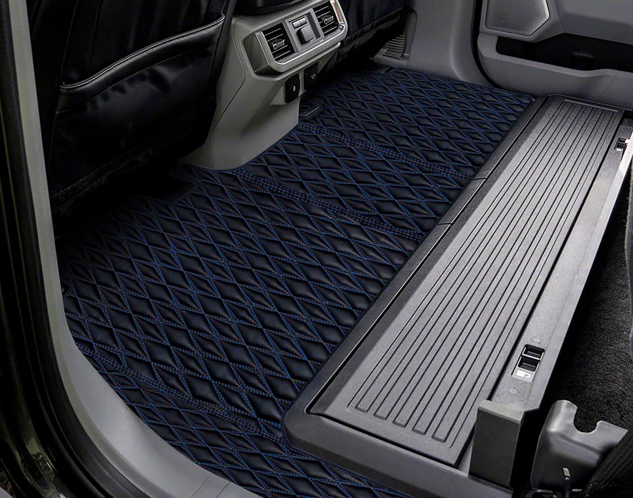Stylish and Durable Floor Mat Set. The Floor Mat Set is designed to provide superior protection and a touch of style to the interior of your 2019-2026 Ranger SuperCrew. Featuring a matte black finish with dark blue thread stitching, this set enhances the look and feel of your vehicle's interior.