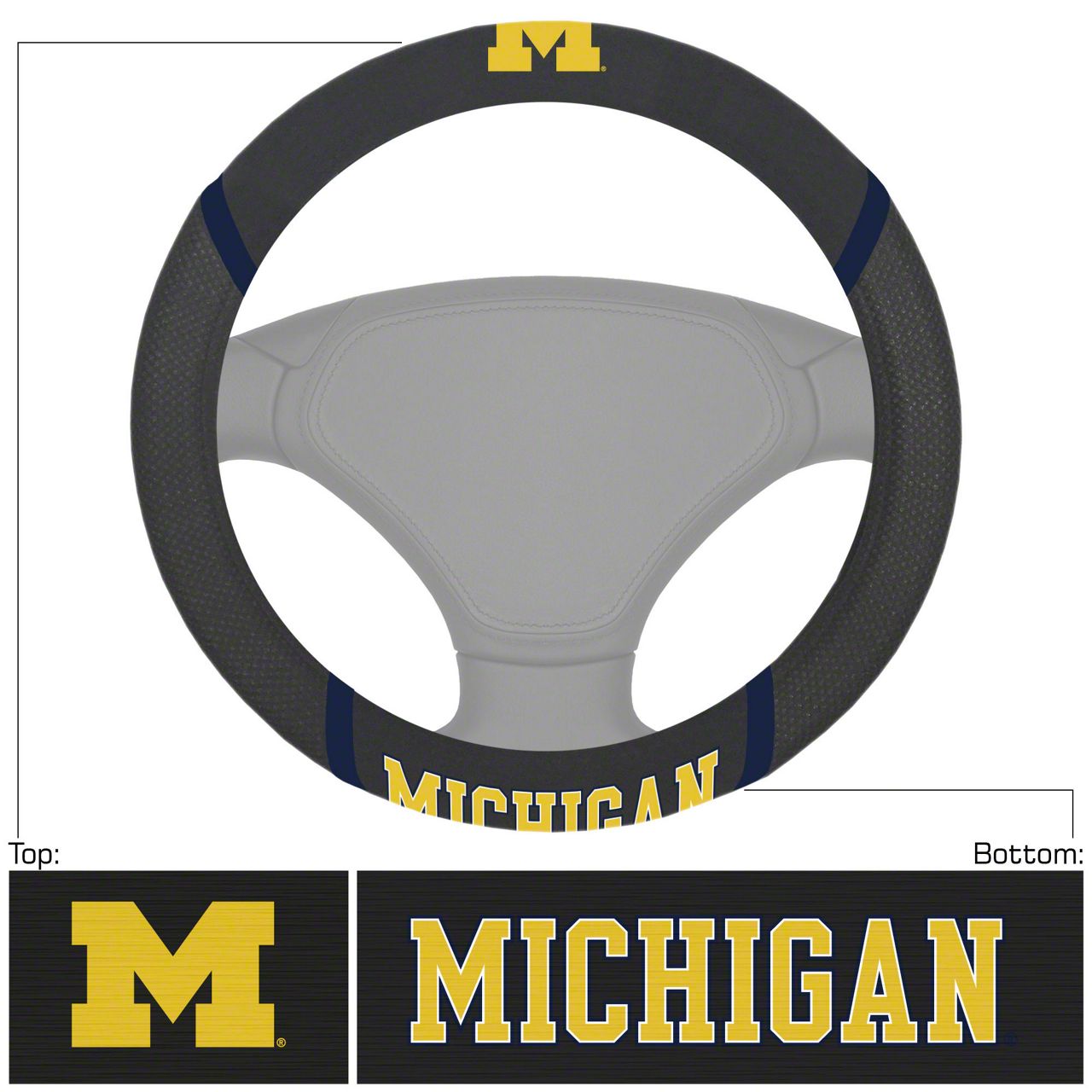 Application. The Steering Wheel Cover with University of Michigan Logo offers universal fitment.