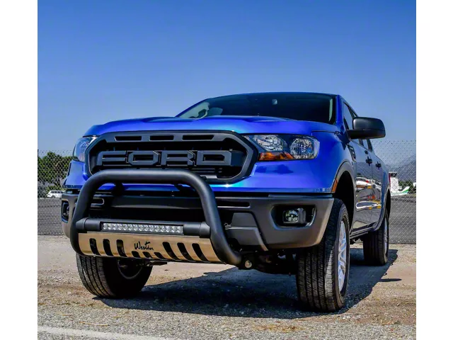 Tough Off-Road Shield. Equip your Ford Ranger with an aggressive off-road armor by installing this Ultimate LED Textured Black Bull Bar. This front armor comes with an auxiliary light and a removable, brushed skid plate. This ultimate assembly will reinforce your truck’s front-end protection and will let you fearlessly tackle the wooded trails and rocky terrains.