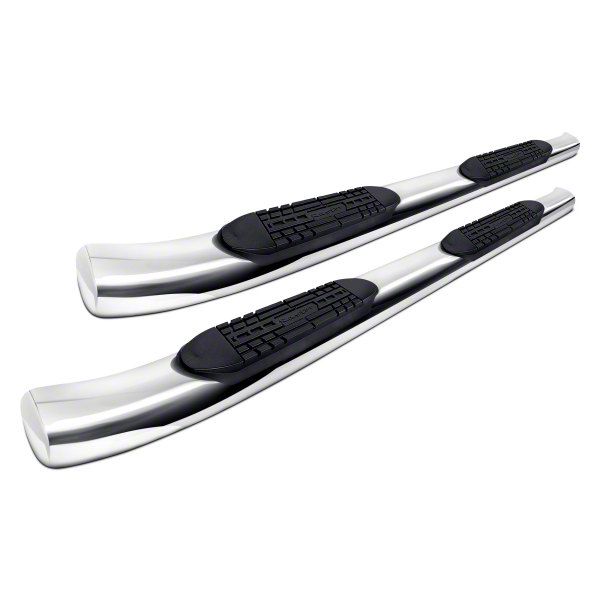 Five-Step Polishing System. Elevate your vehicle's style and functionality with the Raptor Series 5-Inch OE Style Curved Oval Side Step Bars; Polished Stainless Steel. These meticulously crafted Nerf bars come fully assembled and equipped with all the necessary hardware. With their innovative 5-inch raised saddle-style step pad featuring the Raptor Series logo and a 30-degree curve at both ends, these bars not only provide easy access to your vehicle but also add a touch of sophistication to its appearance. Thanks to a revolutionary 5-step polishing system, these stainless steel step tubes gleam like chrome and maintain a long-lasting shine. The highly polished welded end caps complete the look, ensuring that your vehicle stands out wherever you go. Plus, these Nerf bars are built to last, with each bar rated to hold over 500 pounds.