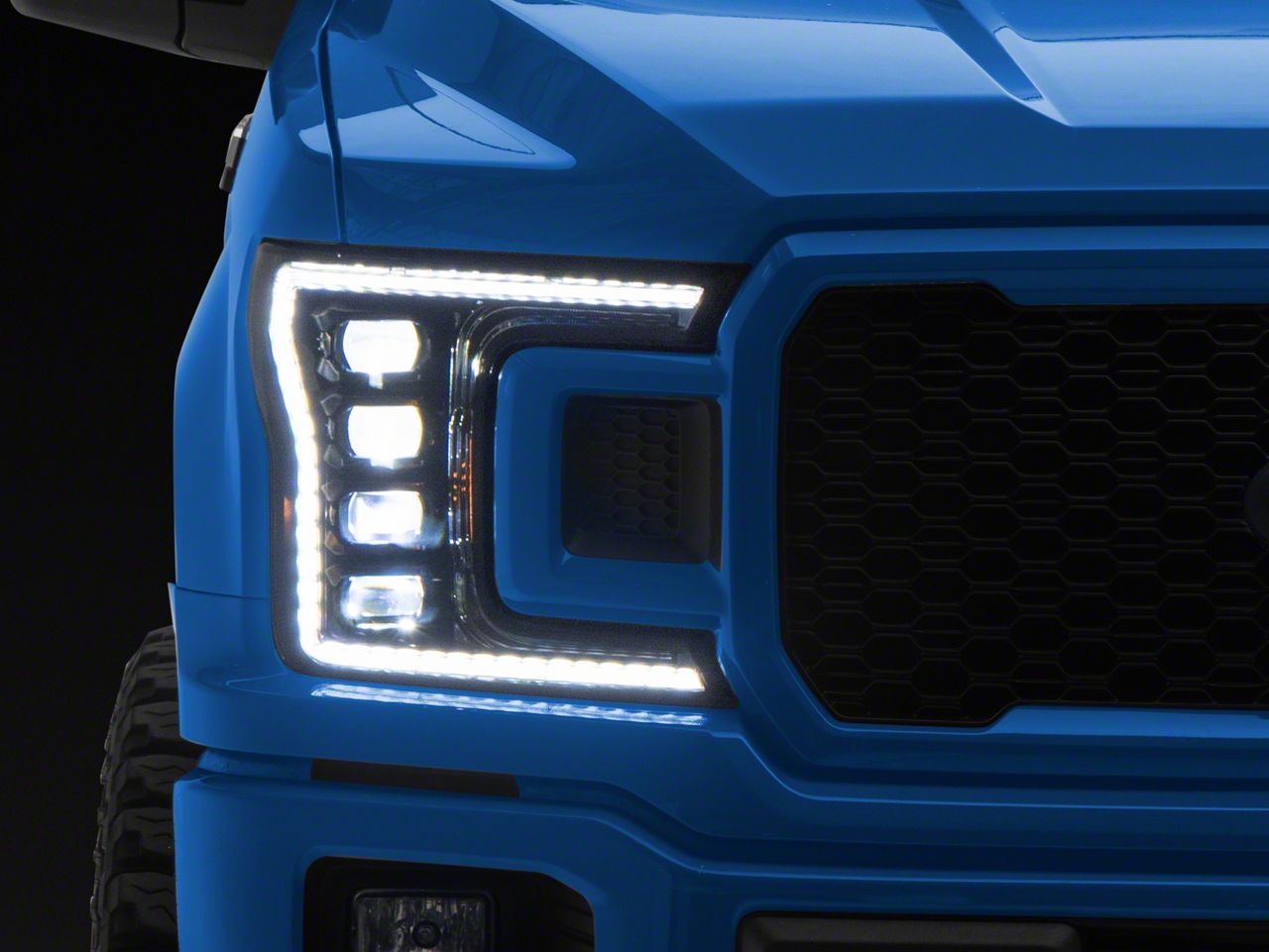 Superior Illumination. Employing a projector lens design with a triple LED setup, these Raxiom Headlights will light up the road ahead with a bright focused beam for better nighttime visibility. The stylish white LED Daytime Running Light (DRL) accents ensure that you are visible day or night by distracted drivers. While the amber switchback turn signal indicators bring an updated look to your F-150. These headlights feature sequential turn signal function.