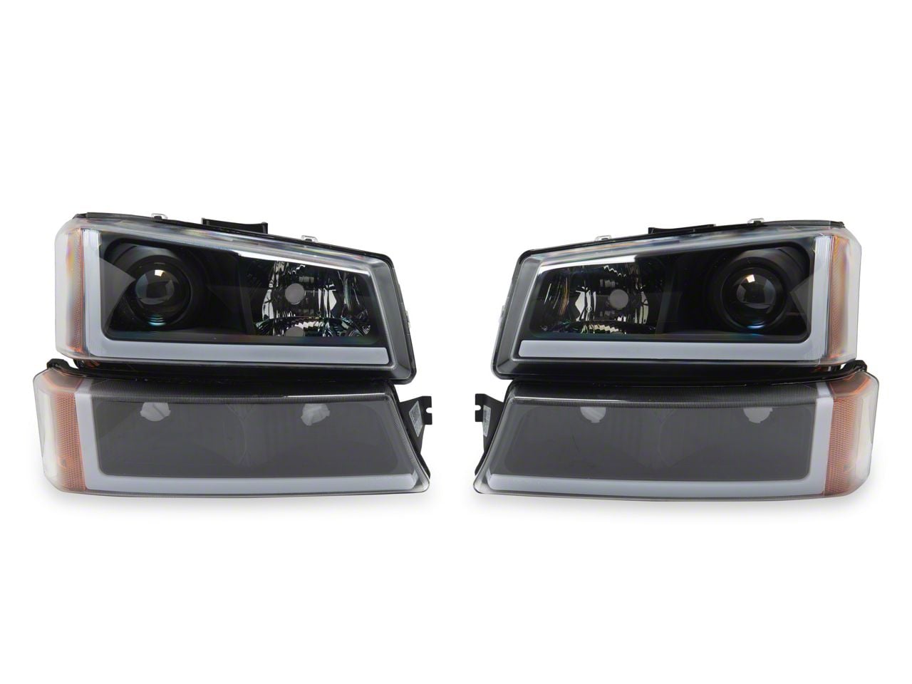 Application. These Raxiom LED Bar OE Style Projector Headlights with Bumper Lights; Black Housing; Clear Lens are designed to fit 2003-2006 Chevrolet Silverado 1500 models. Sold as a set of four, driver and passenger side lights are included.