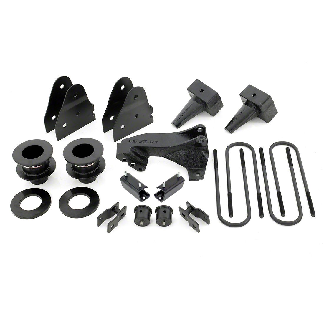 Brawny Steel Shock Extension Spacers. The 3.50 inches of front lift is provided partly by a pair of shock extension spacers. These shock extensions deliver superior durability and an OE-style fit thanks to their precision-fabricated construction. To ensure these spacers provide you with unmatched reliability, these are also finished in a tough black powder coating for optimum rust protection.
