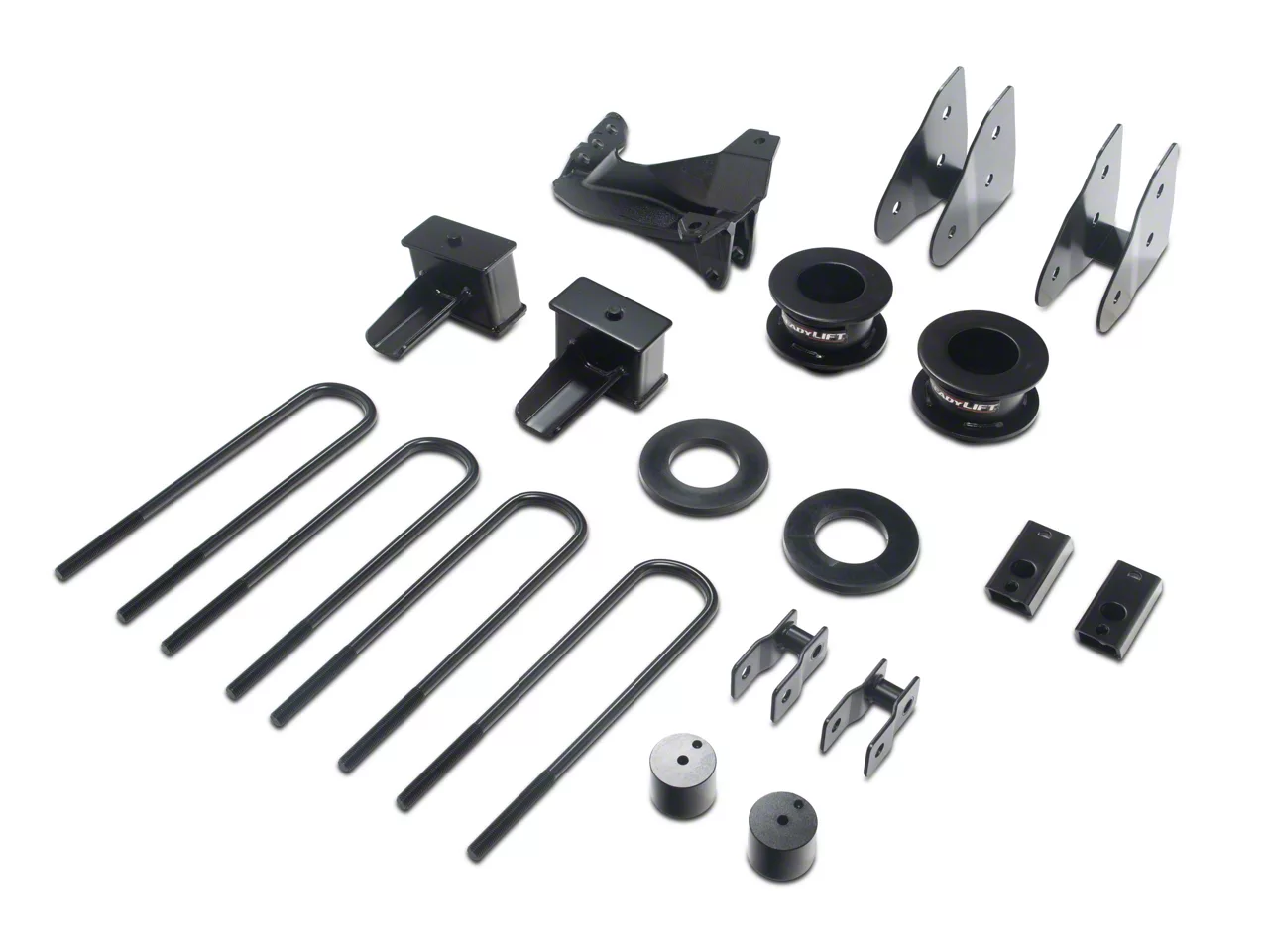 Brawny Steel Coil Spring Spacers. The other set of components responsible for 3.50 inches of front lift is a pair of steel coil spring spacers. These spacers are precision-cut and formed from brawny steel for a reliable fit as well as optimum durability. These spacers are then finished in the same specialized black powder coating for rust protection.