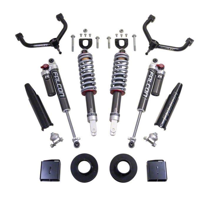 Construction and Appearance. Featuring Falcon 2.1 struts and shocks, this lift kit is designed for superior performance and durability. The high-quality components ensure a smooth ride both on and off the road, while allowing the use of up to 35-inch tires for a more aggressive stance.