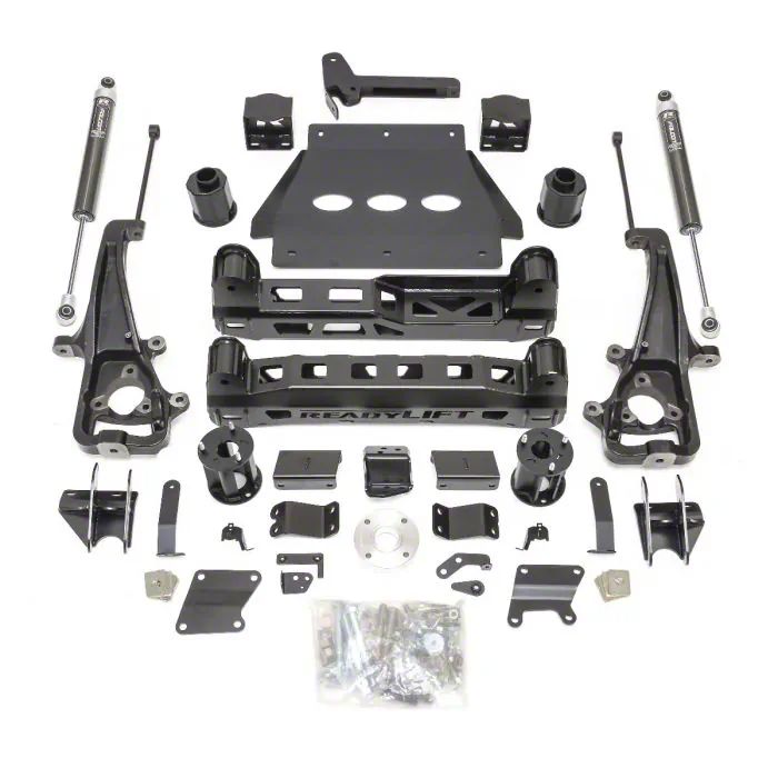 Full Body Lift. Built for the RAM 1500 with Air Ride, this ReadyLIFT Big Lift Suspension Lift Kit is a full lift kit that raises your ride by 6-inches. Made with a matte black finish, this kit includes top mount air strut extensions, shocks, a panhard bar bracket, a skid plate, sway bar end links, crossmembers, and cast iron knuckles. This kit also allows larger 37-inch tires on 9-inch wheels with 0-offset.