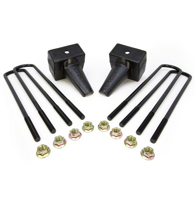 Equipped with Longer U-Bolts. This rear lift block kit is equipped with longer U-bolts. These components help to improve your truck’s handling characteristics while maintaining its new ride height. Furthermore, these U-bolts are applied with an e-coated finish to enhance their protection against rust.