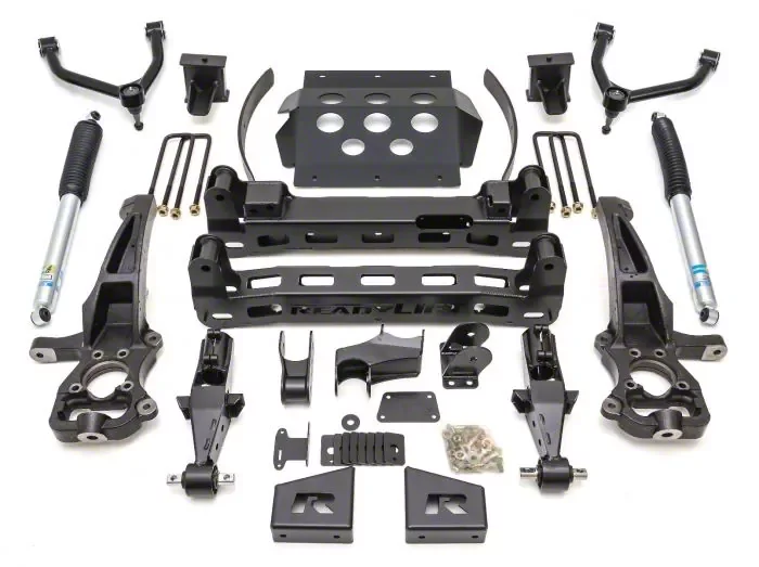 Heavy-Duty Components. This big suspension lift kit includes parts that are made of heavy-duty steel to guarantee their strength and long-lasting dependability. They have been pre-matched and tested for compatibility and efficiency. This kit includes components such as cross-members, arm brackets, knuckles, differential drop brackets, sway bar end links, cv axle spacers, rear lift blocks, bump stop extensions, skid plate, Bilstein rear shocks, and installation hardware.