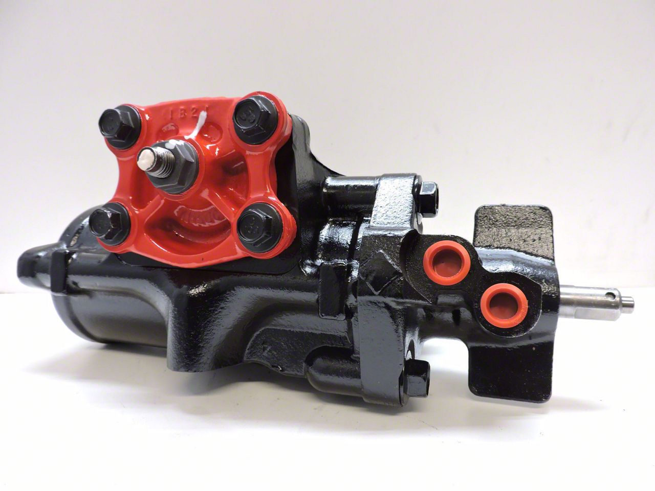 Construction and Appearance. Built for reliability, the robust housing is protected by a durable matte black and glossy red coating to resist wear and corrosion, helping the assembly hold up in harsh environments. OE-compatible dimensions and interfaces support a seamless transition to factory linkages and components, while the included new pitman arm nut helps ensure a secure, service-ready connection. Precise internal tolerances and careful assembly contribute to smooth assist and stable, predictable steering behavior over time.