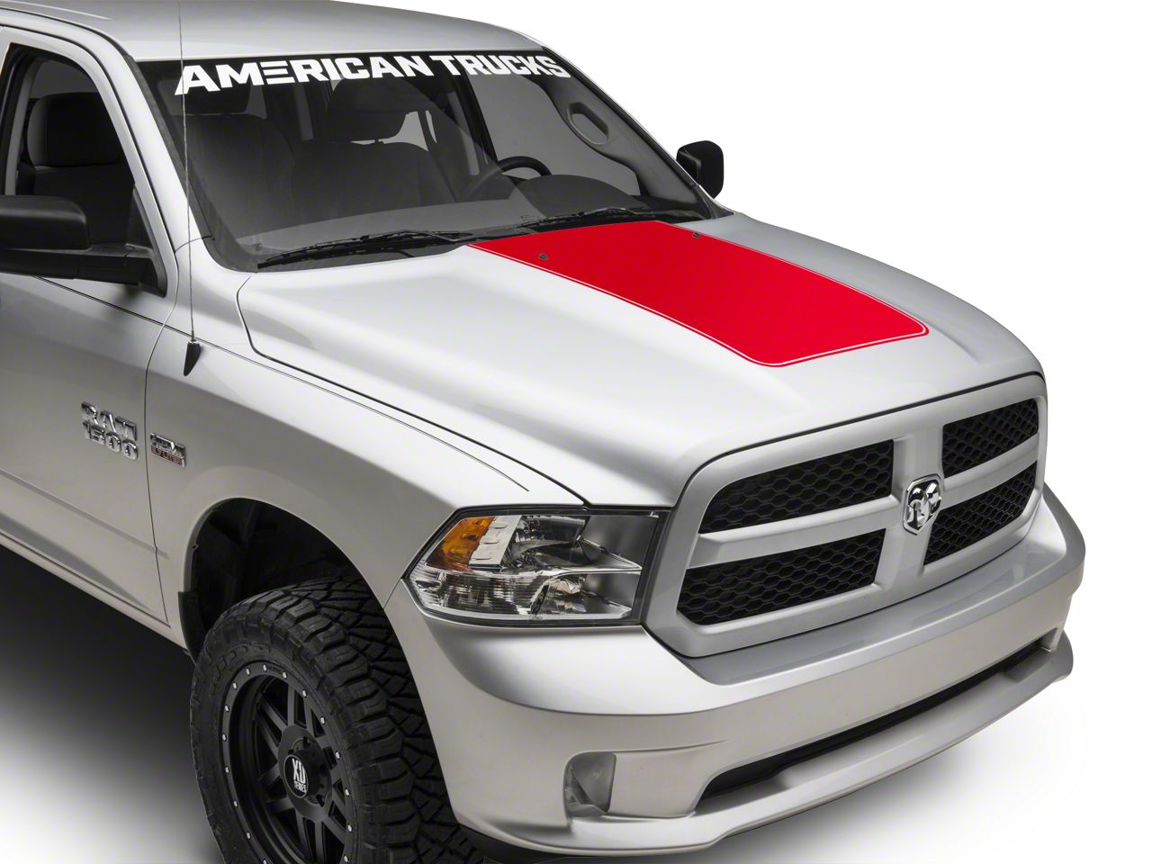 Muscular Styling. A Gloss Red Hood Decal from AmericanTruck Graphics is a great way to add muscular styling to your very own 2009-2018 RAM 1500. This Decal is an easy and inexpensive way to enhance the look of your RAM's power bulge Hood. This Gloss Red Decal features a wide center stripe, that is accented by a thinner pinstripe for a classic, muscular appearance.