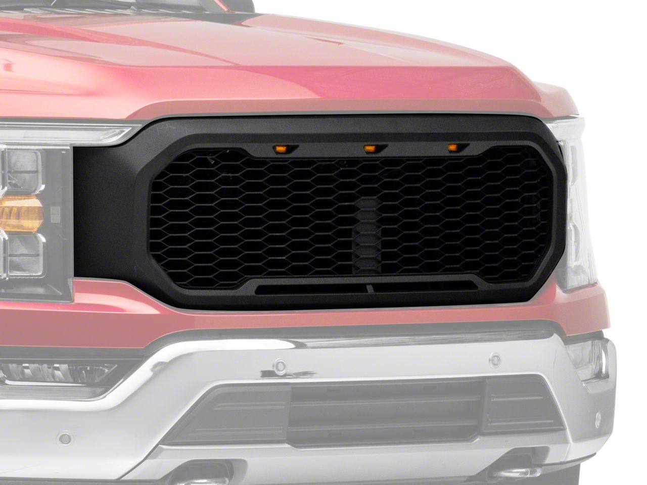 Forceful Baja Styling. Add forceful Baja styling to the front end of your 2021-2023 F-150 with a RedRock Upper Replacement Grille. Featuring a unique honeycomb style pattern, this Baja inspired Grille includes three integrated LED accent lights across the top for a rugged appearance. Designed to be installed in place of your factory grille, this RedRock Grille will transform the appearance of your F-150 from a mild mannered daily driver into a mean Baja machine.