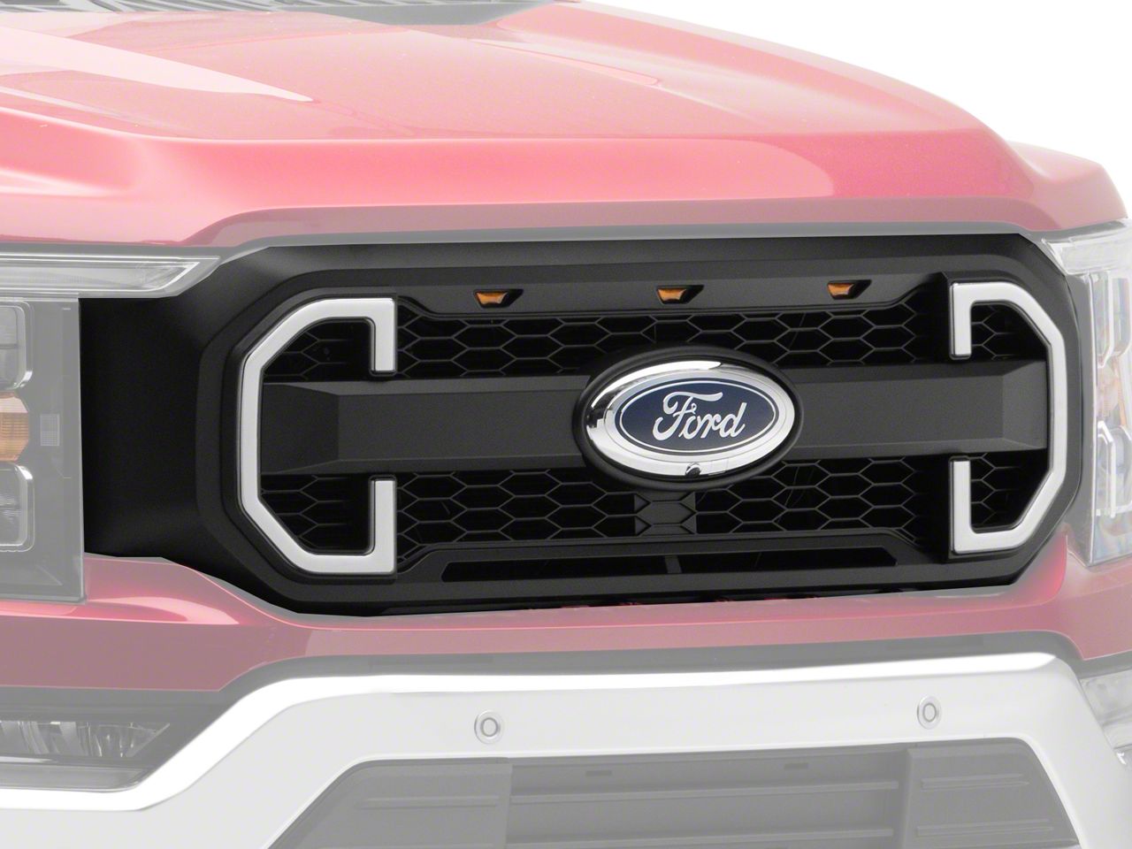 Forceful Styling. Add forceful styling to the front end of your 2021-2023 Ford F-150 with a RedRock Upper Replacement Grille. Featuring a unique honeycomb style pattern, this Baja inspired Grille includes three integrated amber LEDs across the top and two uniquely shaped LED accent lights. Designed to be installed in place of your factory grille, this RedRock Grille will transform the appearance of your F-150 from a mild mannered daily driver into a mean off-road machine.