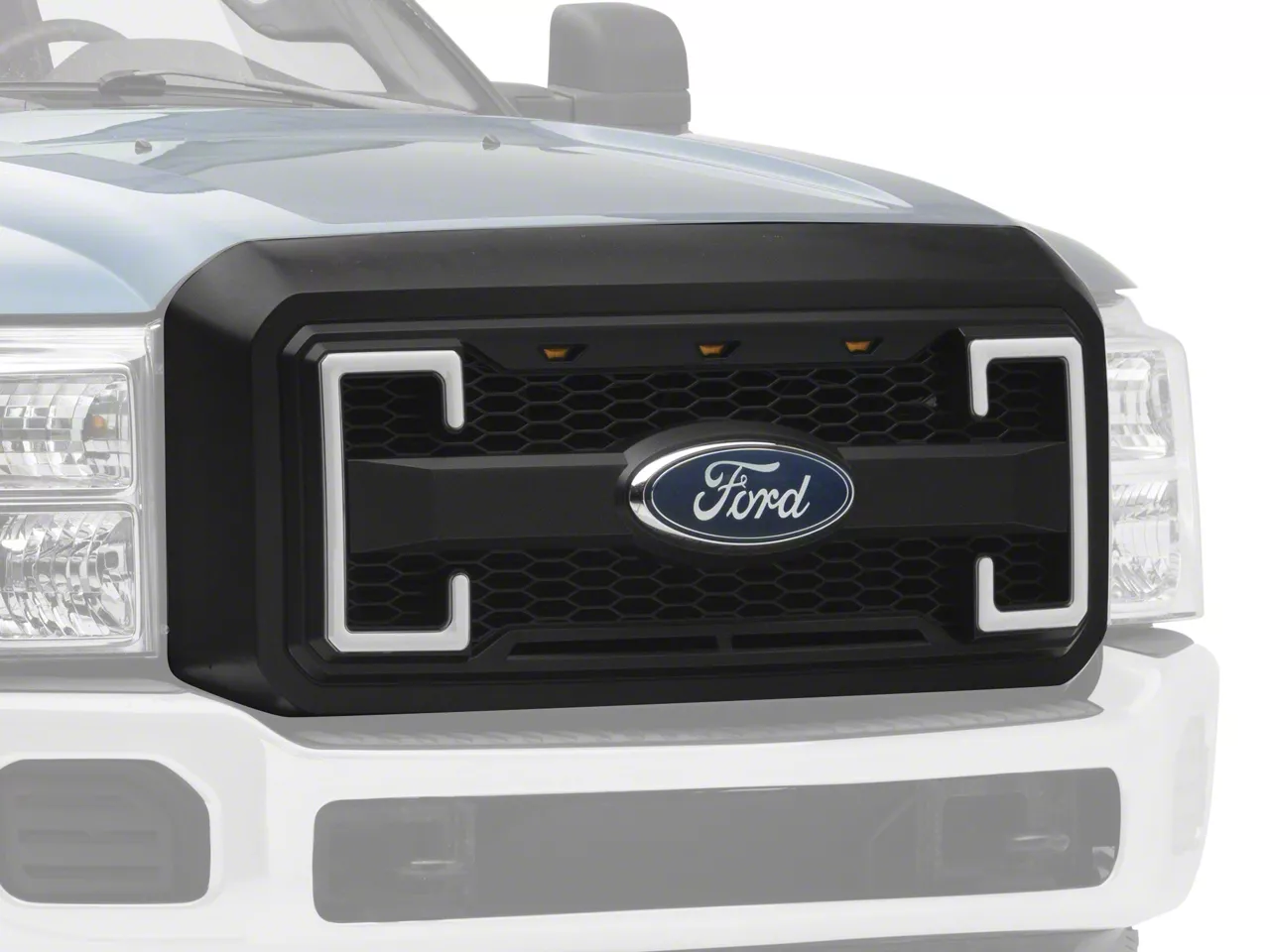 Forceful Styling. Add forceful styling to the front end of your 2011-2016 Ford F-250 with a RedRock Upper Replacement Grille. Featuring a unique honeycomb style pattern, this Baja inspired Grille includes three integrated amber LEDs across the top and two uniquely shaped LED accent lights. Designed to be installed in place of your factory grille, this RedRock Grille will transform the appearance of your F-250 from a mild mannered daily driver into a mean off-road machine.